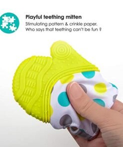 Details: Find relief and fun all in one! The Glüv is designed to provide stimulating gum massages thanks to its many textures. Baby can self-soothe teething pain without the inevitable drop of a regular teething toy. Fun toy with vivid colors and crinkle paper sounds.