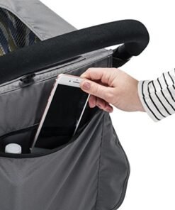 - UV 50+ canopy with ventilation window, large storage basket, and a zippered storage pocket