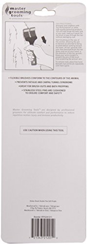 Details: Exclusive Master Grooming Tools Flexible Slicker Brushes give you the flexibility you need to deliver superior grooming results without sacrificing your hands and wrists in the process. Flexible brush heads produce less stress on your hands and wrists than traditional fixed slicker brushes. Flexible brushes conform to the contour of the animal. • Smaller, single/soft brushes are ideal for smaller areas/lighter jobs • Larger, double/soft brushes are ideal for larger areas/daily brushing • Smaller, single/hard brushes are ideal for smaller areas/mild mats • Larger, double/hard brushes are ideal for larger areas/coarse coats • Smaller, single/extra-firm brushes are ideal for smaller areas/tough matting • Larger, double/extra-firm brushes are ideal for larger areas/wiry coats Available in a single or double brush, and with soft, firm, or stiff pins. Sizes: Single Flexible Slicker Brushes – 8″L x 1¾”W; Double Flexible Slicker Brushes – 8″L x 4″ W